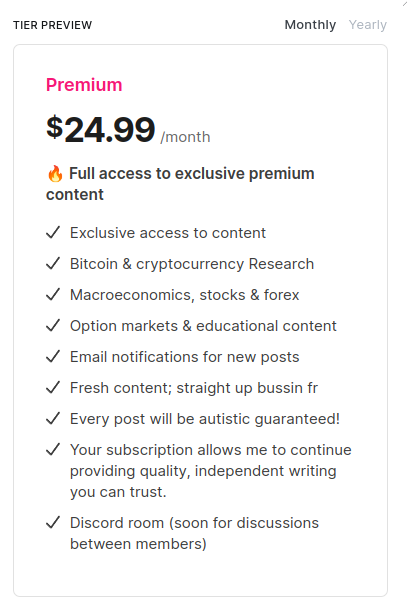A subscription is $25, which will also include airdrop hunting which should cover the subscription fees if you stay subscribed & committed. You're also supporting me into continue to deliver more writing, research etc.