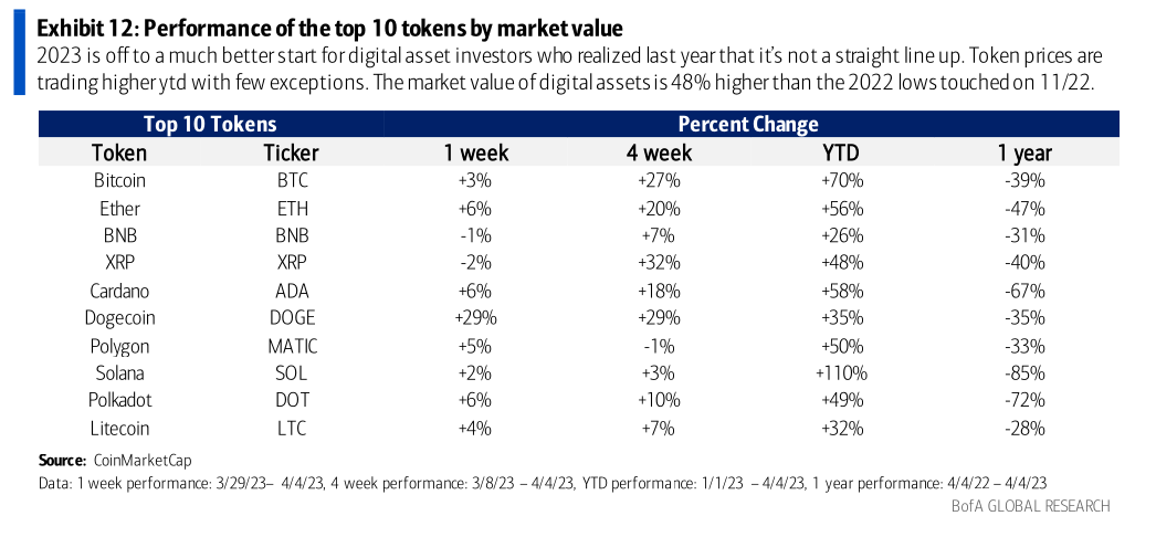 An analysis of the year-to-date performance of digital assets reveals that their market value has appreciated by 47% after falling 64% in 2022.