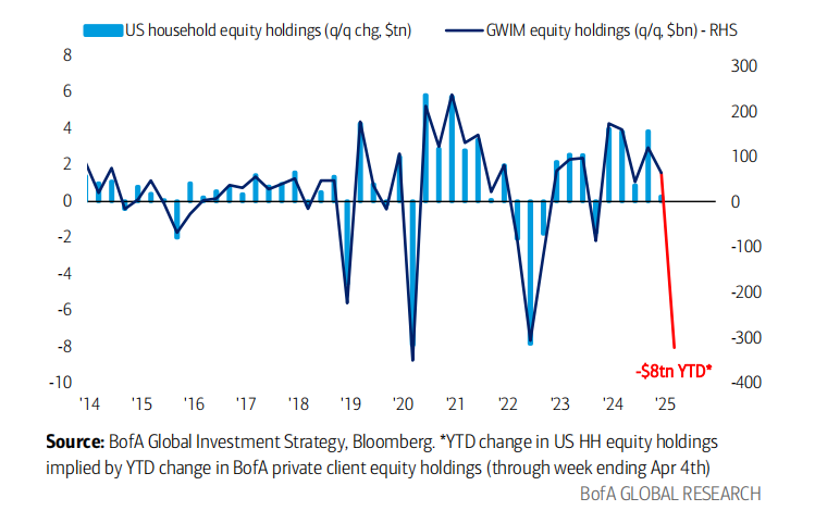 What makes this even grimmer is its coinciding with a serious negative wealth effect at home as -$8 trillion year-to-date decline in US household equity holdings, a sharp reversal from 2024s $9tn wealth gain (Damn, I am starting to miss Biden)..