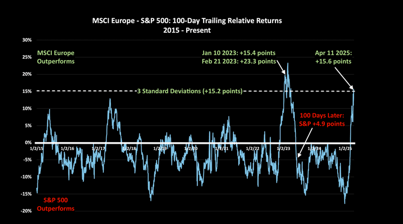 Currently, 76% of the MSCI ACWI country indices are trading below both their 50-day and 200-day moving averages. This figure is approaching, but has not yet reached, the BofA “Global Breadth Rule,” which is triggered when it hits 88%. Historically, when this signal activates, the MSCI ACWI tends to rally by 4–5% over the next four weeks.