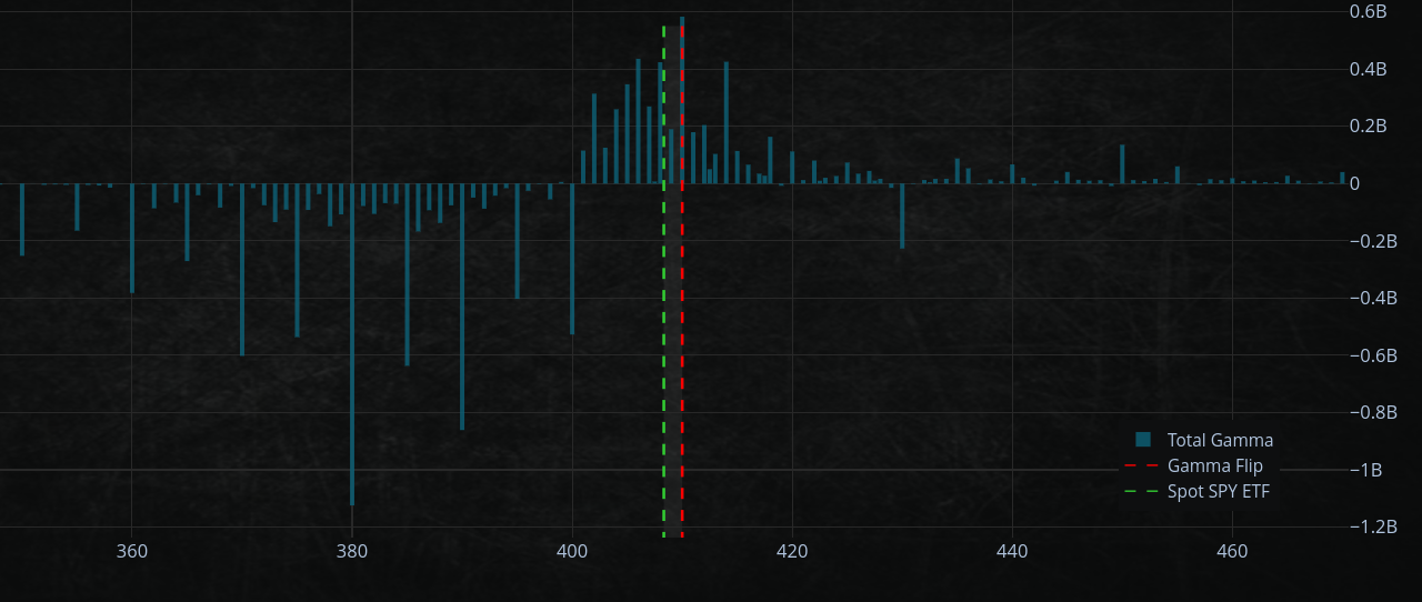 Today's expiration is not particularly large, but a significant portion of SPY's gamma expires today. Most of this gamma is concentrated in the 400-410 range.