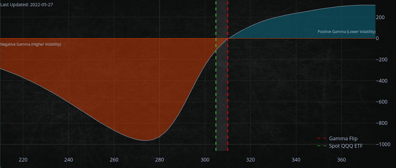 When option dealers are "short Gamma," they're positioned for limited moves in the underlying asset. That often happens when traders are bearish on the index (Nasdaq) and expect it to move lower. However, because all moves are magnified in Short Gamma land, the underlying (Nasdaq spot) can make a strong move higher, causing pain for the Short Gamma trader.