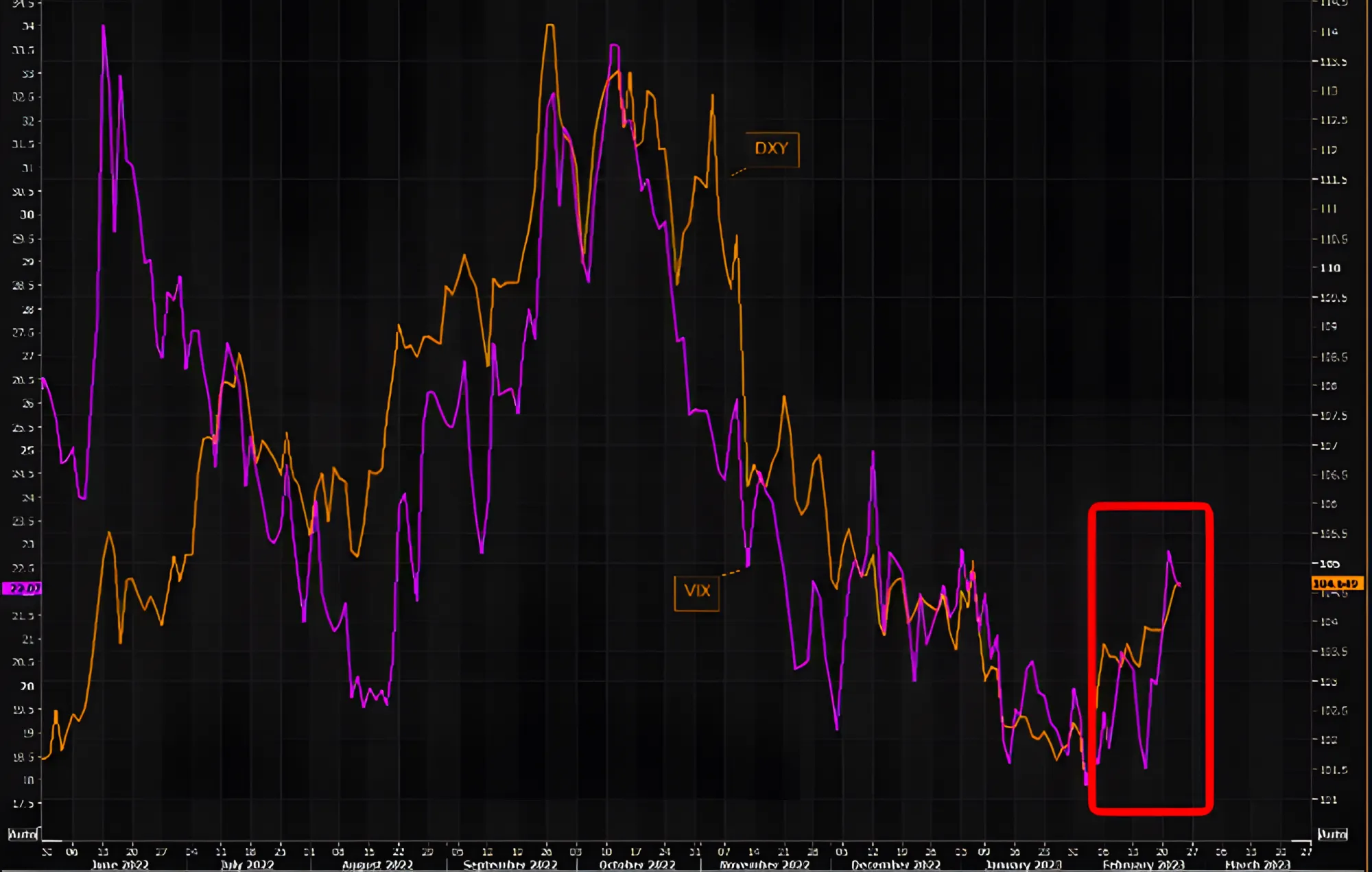 These 2 seem to have a connection now. They both can be used to measure the level of risk in the markets. When the DXY rises and VIX increases, it's an indication that investors are chasing the dollar due to an increase in risk aversion. This heightened level of market stress may be caused by multiple factors, such as geopolitical risk, economic uncertainty, or news about the company's performance and earnings.