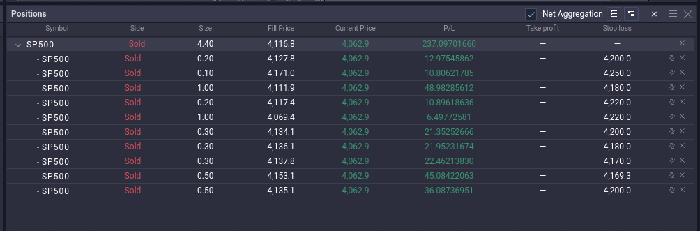 I used multiple orders over a few days, and you can close each trade if you like by pressing the "x" button.