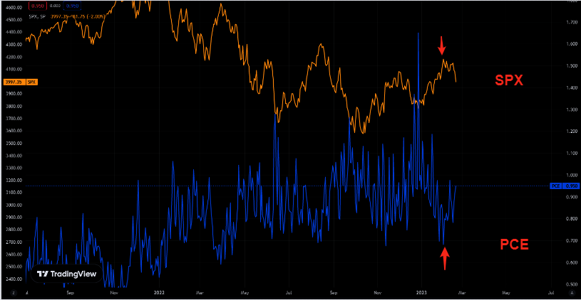 The chart below shows the SPX500 and the PCE (Put Call Ratio Equities). The SPX500 peaked. On the other hand, the PCE bottomed out at the same time.