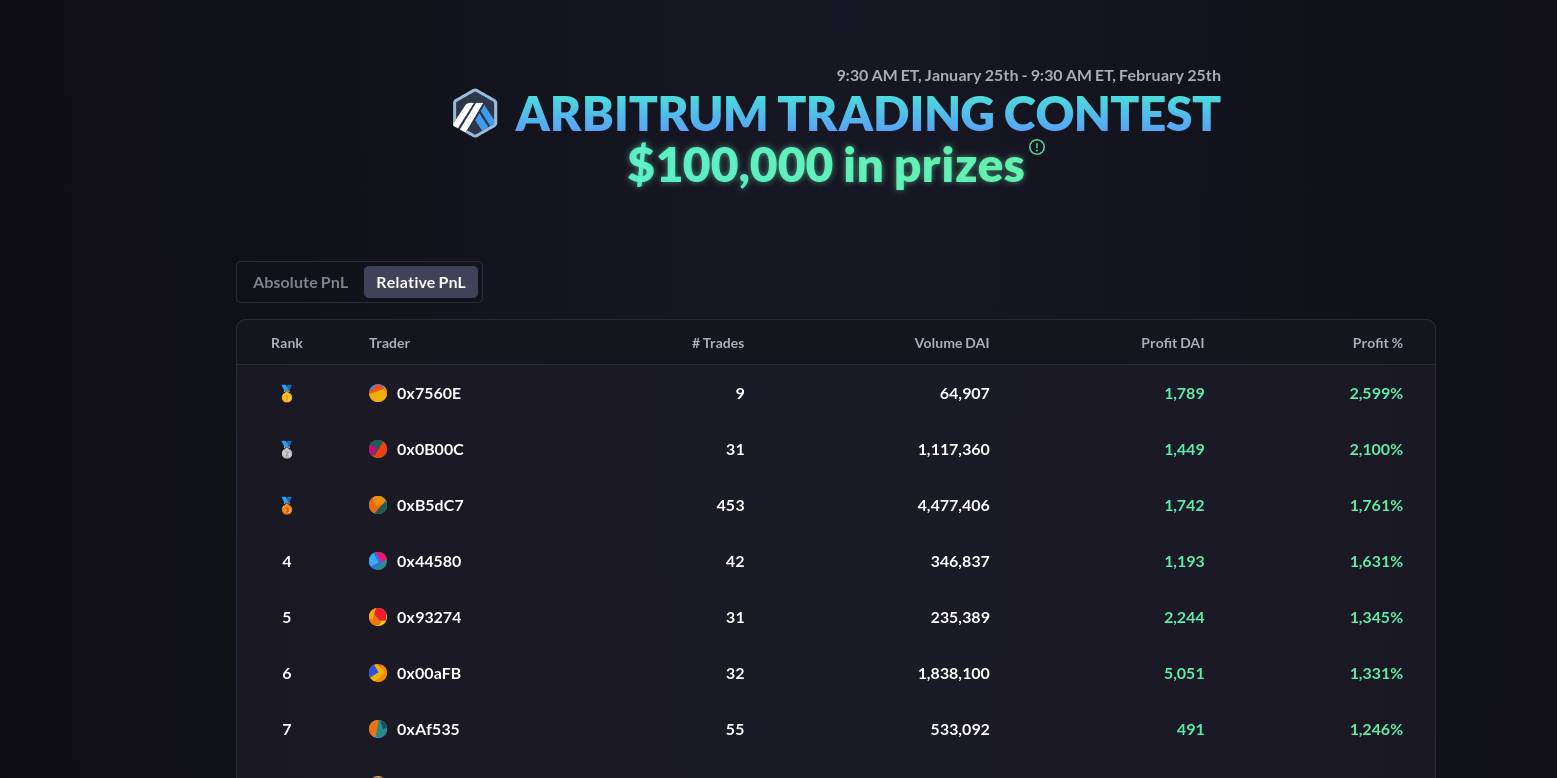 There's still a contest ongoing, $100k in prizes for the Arbitrum trading contest.