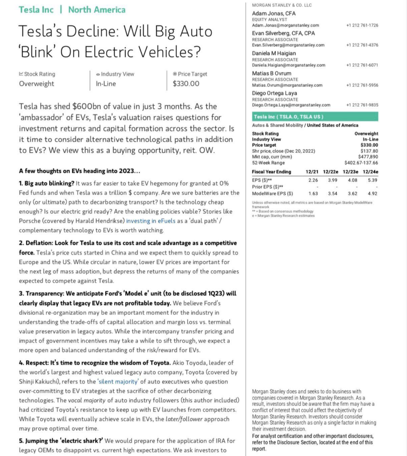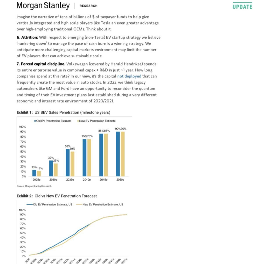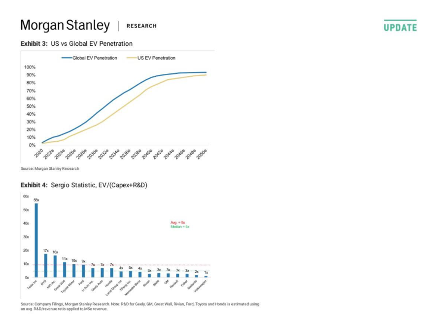 Adam Jones from Morgan Stanley released a note a few hours before Tesla dropped 10%. In the note, Jonas discussed how rising rates can affect electric vehicles as a whole, how Tesla's discounting prices are important for mass adoption, how Ford's divisional reorganization is an important example of capital allocation, and how companies like Volkswagen spend a large number of their resources in capex, research, and development (R&D).