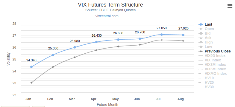 The VIX term structure is an important market volatility measure that has shifted significantly higher. This can be seen by the short end of the curve.
