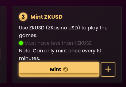 Then click on “Mint” to mint ZKUSD (ZKasino USD) to play the games.
