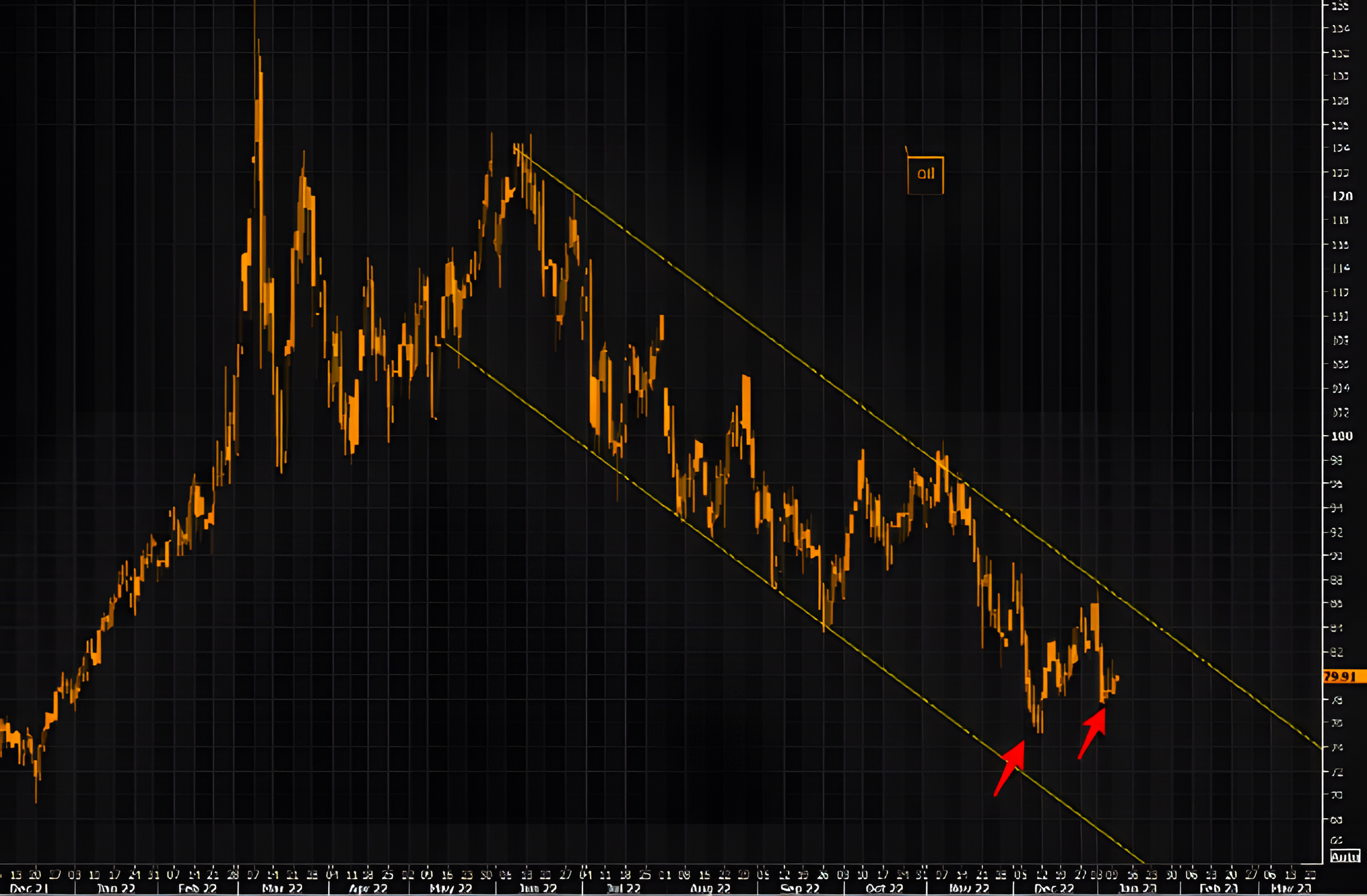 This chart shows a potentially higher low on the price of oil, although momentum is still weak. Any downside from the current price could be limited as long as the OPEC+ cut goes through and demand after the Chinese New Year is robust. It is recommended to take a cautiously optimistic approach to trade oil at the current time.