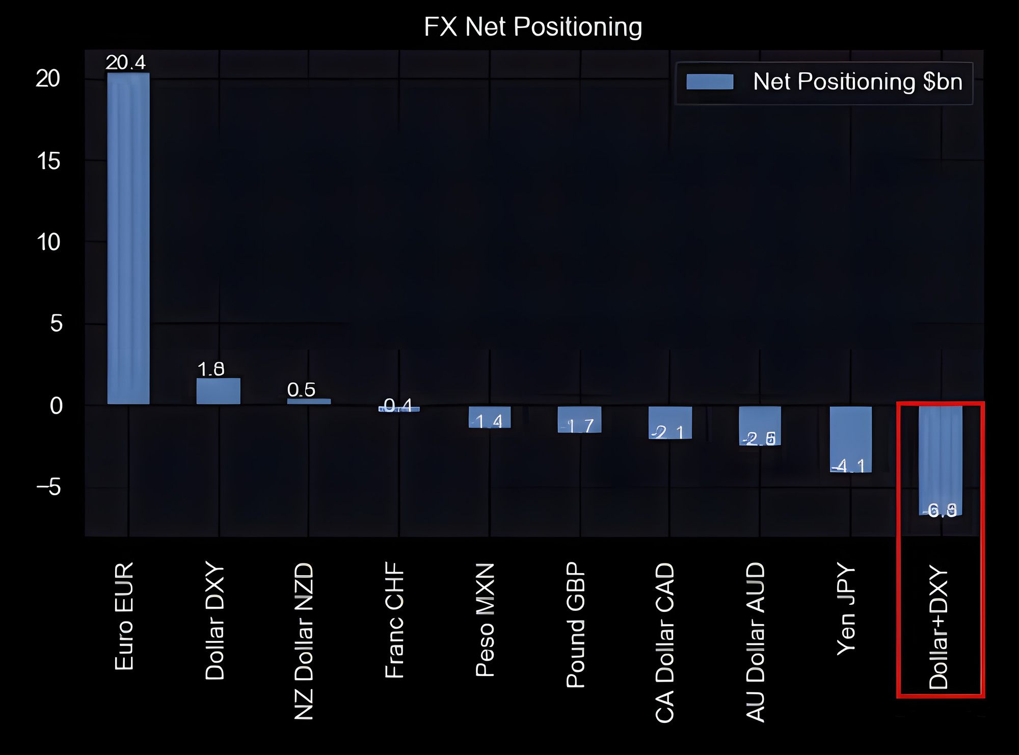 Lastly, a net position of negative -$6.8 billion in the combination of the U.S. Dollar and DXY, meaning that they have an even stronger negative or short exposure to the U.S. dollar compared to the other currencies they hold.