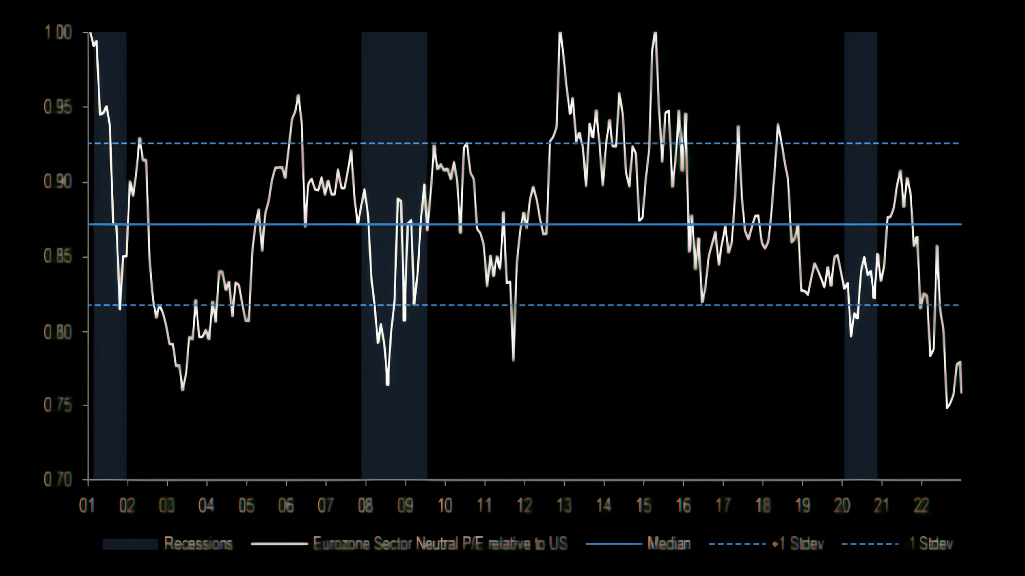The MSCI Eurozone sector neutral P/E (price-to-earnings) relative to the MSCI US is showing that Europe is now outperforming in common F.X. (foreign exchange).