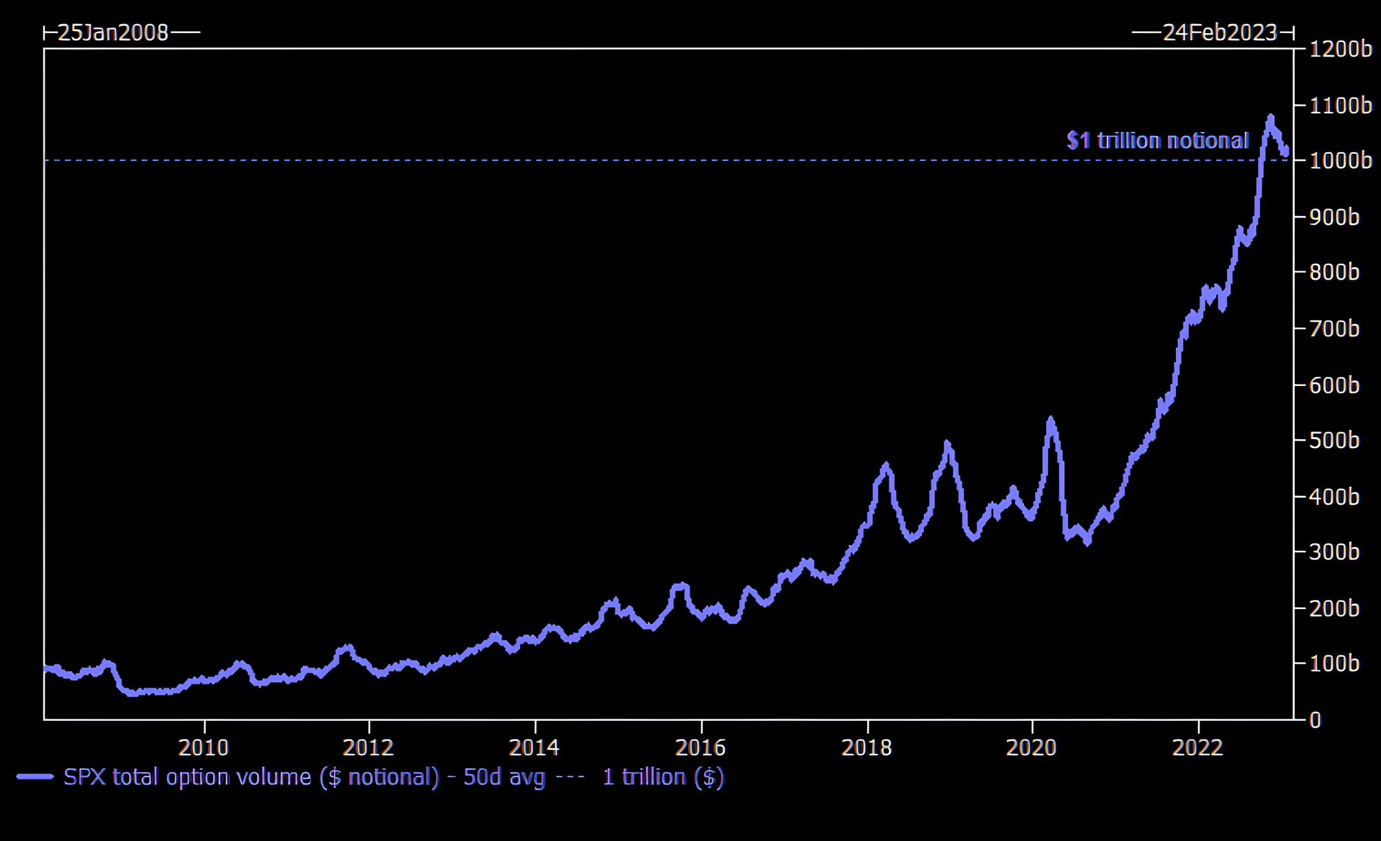 Goldman Sachs' Garret has reported that the 50-day average notional value traded in SPX options is above $1 trillion.