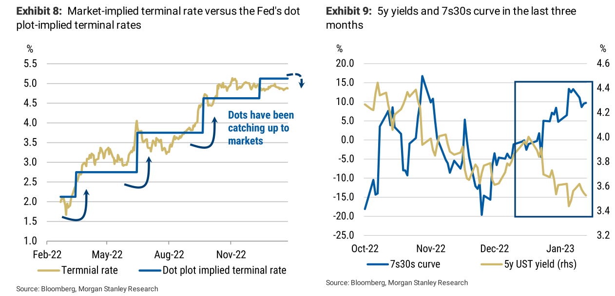 Some strategists at Morgan Stanley have trading strategies targeting the long-term market outlook. These strategies include long 5s, 7s30s Steepeners, and SFRH3H4 Flatteners.