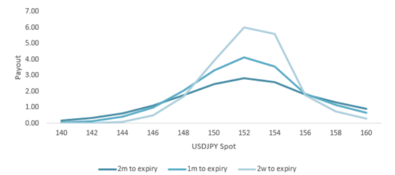 If USDJPY rises but stays close to 152 by December 15, the options you sold will expire worthless, which is good because you sold them, and the 148 call option you bought gained value